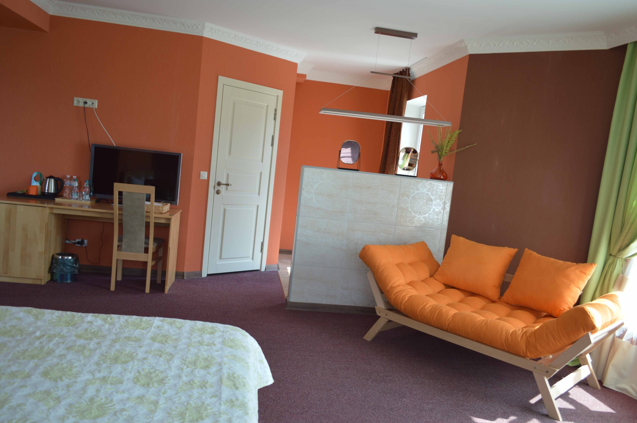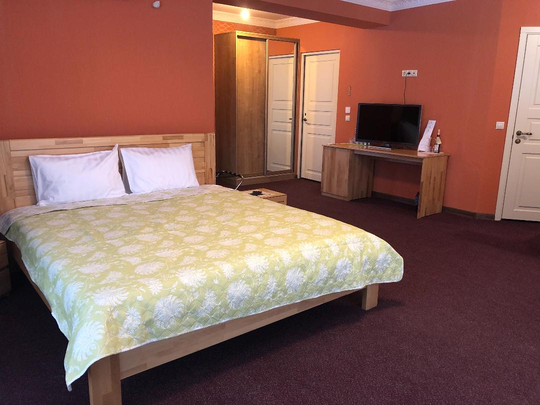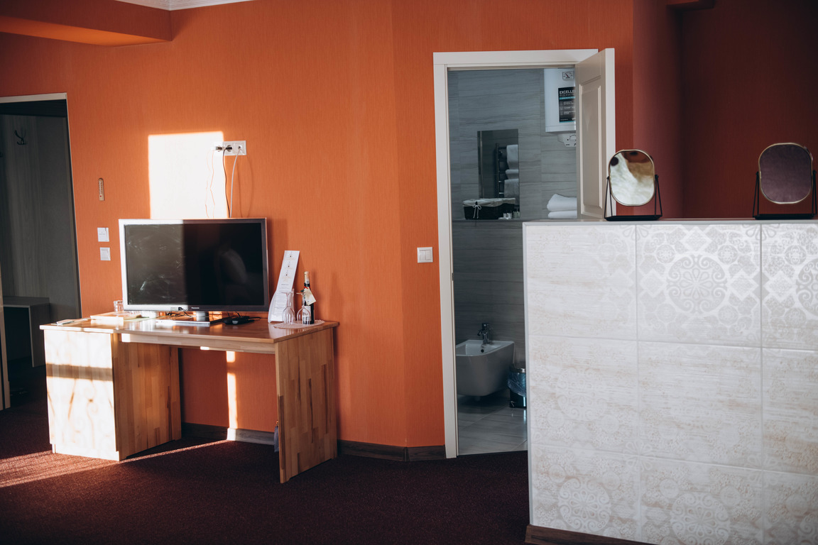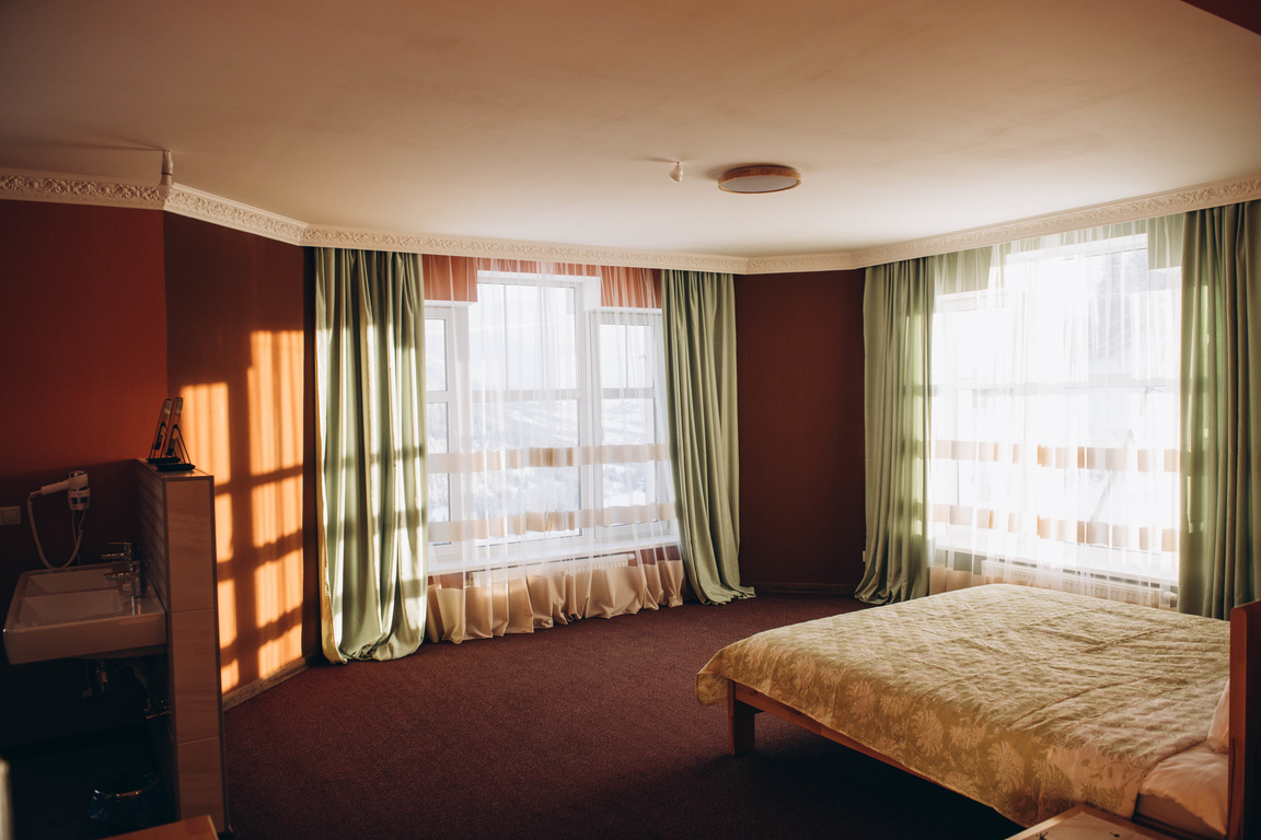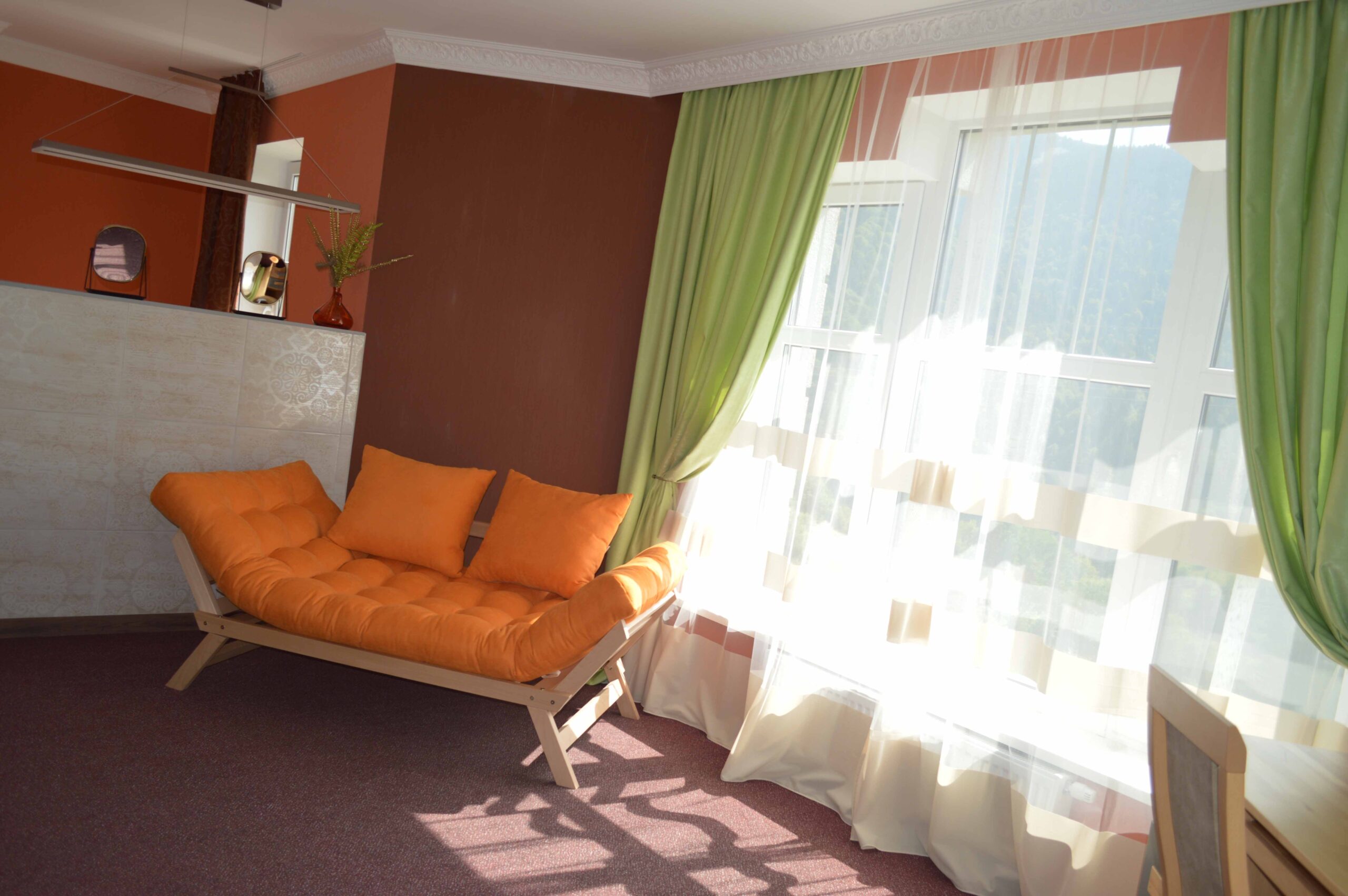 Luxurious suite. Ideal for a romantic trip for two. This room is very exceptional. Large and spacious. There is an opportunity to accommodate 2 more guests. The hotel has only 1 room of this class. The advantage of this room is the huge panoramic windows (2 windows). A very bright room with 4 windows of different sizes and a balcony. One of two rooms in the hotel with a separate open space zone. The design and decor of this room have been thought out with the utmost care. The windows offer views of the valley. Has everything you need for a comfortable stay.