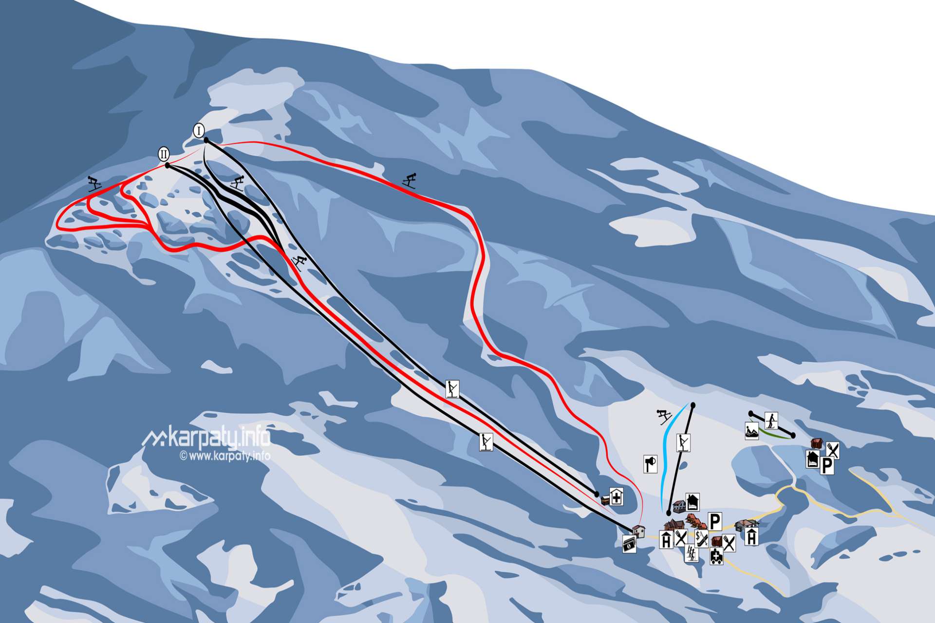 На нижній станції підйомника розташовані: колиба, приміщення з прокатом гірськолижного спорядження, кафе, туалети, каса і медичний пункт. На верхній станції підйомника є оглядовий майданчик з видом на гори, тут працює кафе, є туалет. На місці можна домовитися про уроки катання з інструктором. Тут функціонує електронна система пропуску. На горі працює ратрак. Є служба порятунку.